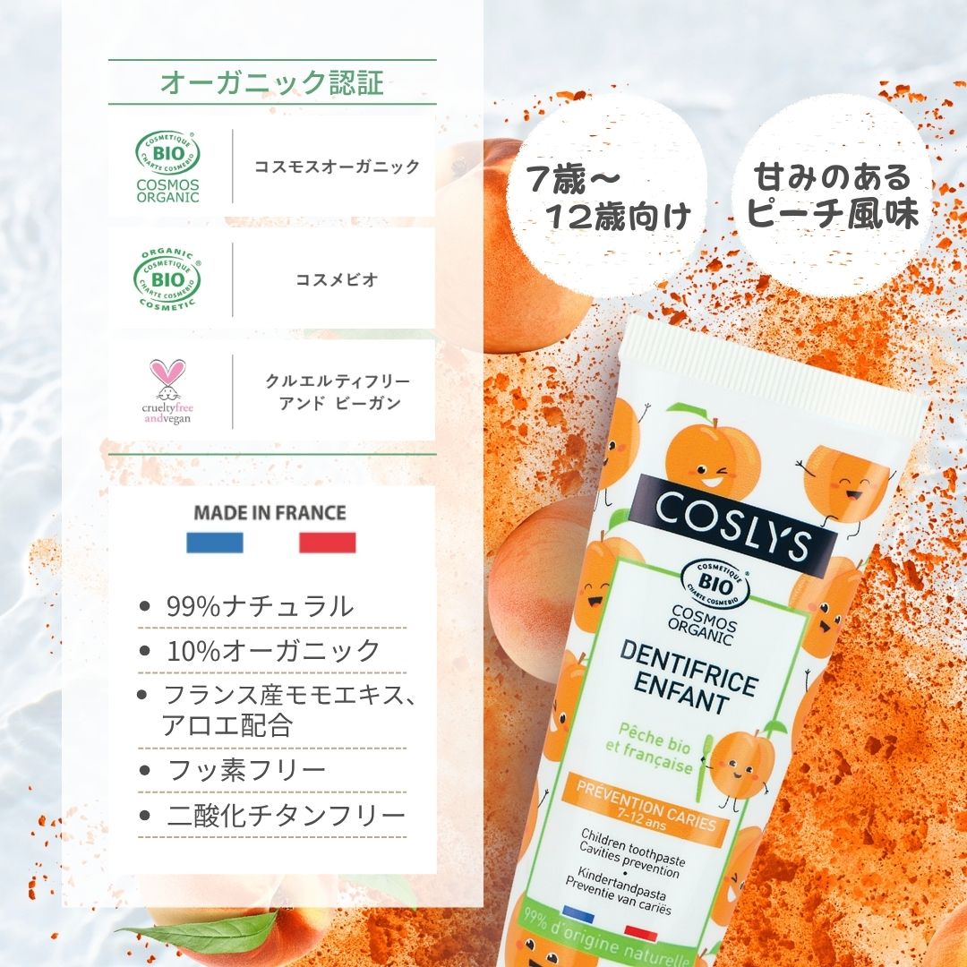 コスリス ジュニア歯みがきジェル ピーチ風味 50ml 7歳〜12歳向け オーガニック&天然由来 キシリトール配合フッ素・二酸化チタンフリー 生え変わる時期に